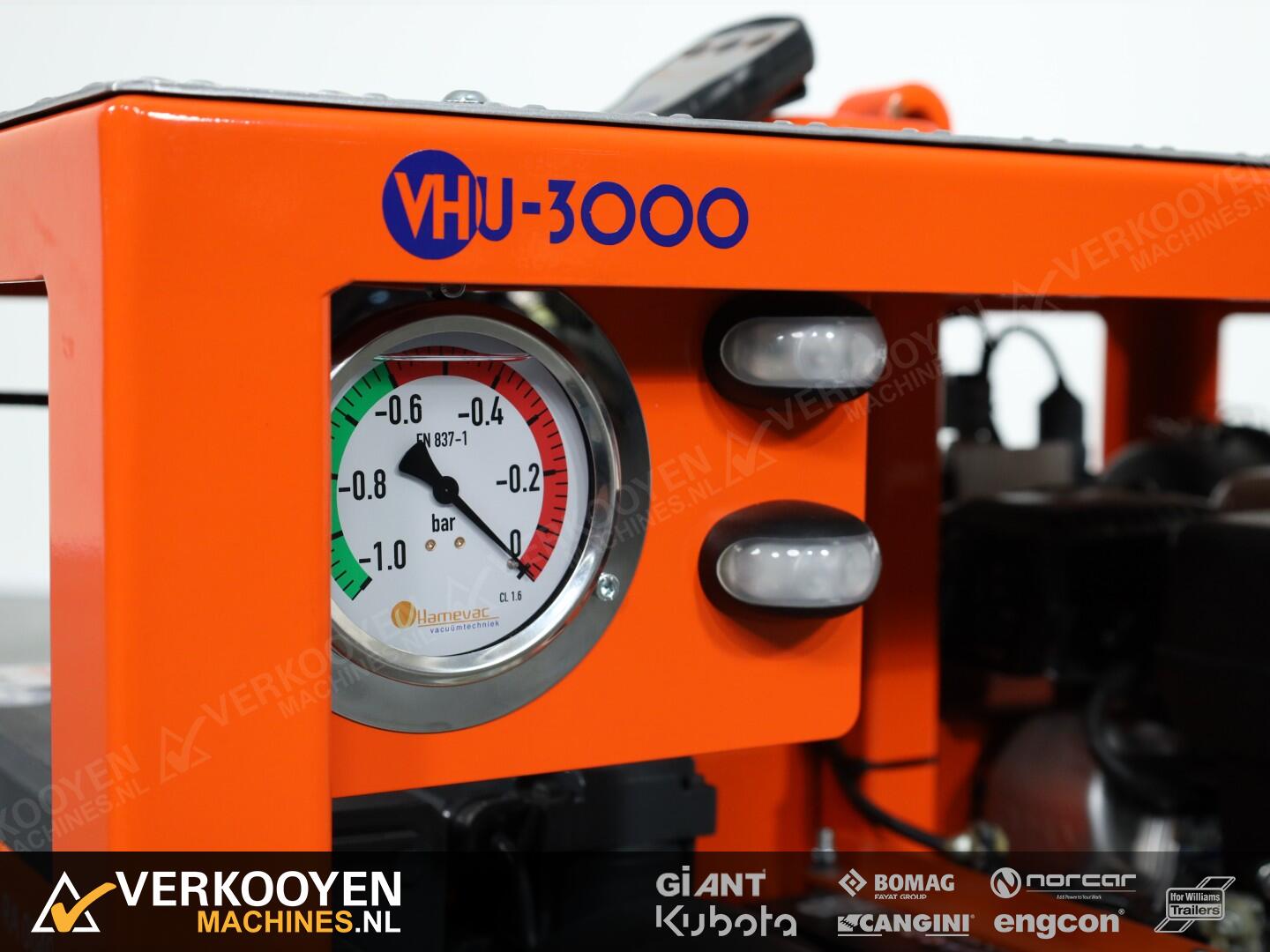 De VHU-3000 is voorzien van een robuust frame met een maximaal hefvermogen van 3000 kg. De unit kan naar keuze met een ketting, of palletvork opgenomen worden. De leden uit de VHU-Serie zijn alle voorzien van een vacuümbuffertank (CE-conform), die er voor zorgt dat het (beton) product blijft hangen, als de aandrijving er onverhoopt mee stopt.