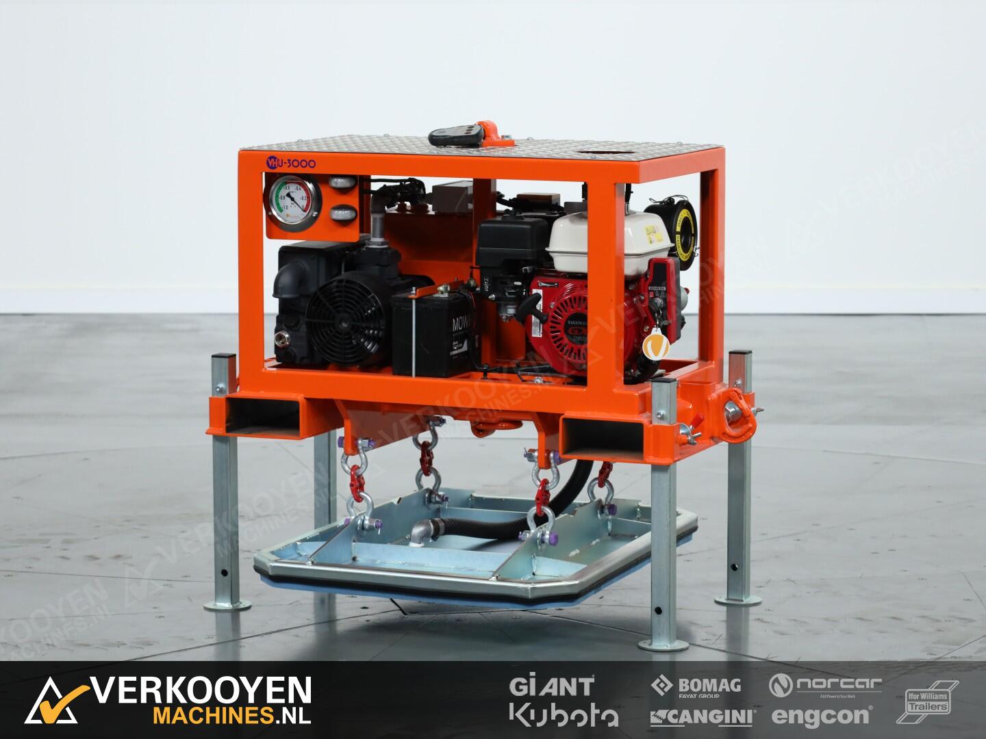 De VHU-3000 is voorzien van een robuust frame met een maximaal hefvermogen van 3000 kg. De unit kan naar keuze met een ketting, of palletvork opgenomen worden. De leden uit de VHU-Serie zijn alle voorzien van een vacuümbuffertank (CE-conform), die er voor zorgt dat het (beton) product blijft hangen, als de aandrijving er onverhoopt mee stopt.